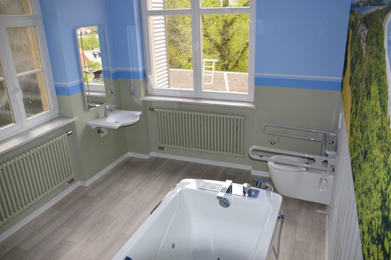 Wellnessbad mit Whirlpool-Badewanne: Unsere moderne Whirlpool-Badewanne bietet wohltuende Entspannung und fördert das Wohlbefinden unserer Bewohner.